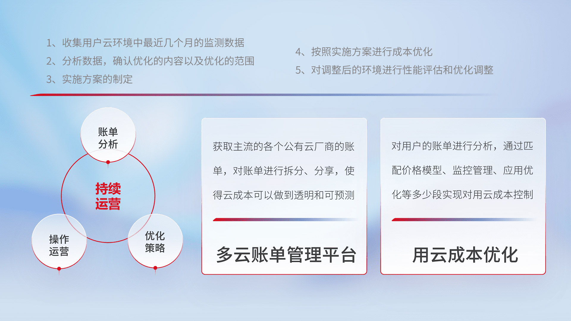 通过多云纳管,,以统一的资源数据模型把客户的云资源进行抽象和封装,,,,进而实现对多云资源的统一操作,,保障云资源管理的可靠性、、、、稳定性与可用性。。量身定制化运维内容,,,配置、、、开发运维、、补丁管理、、、备份、、、、监控、、、认证和访问管理、、、、审计和日常巡检等,,,保障在用云过程中的可靠度,,稳定度以及高可用率。。。。