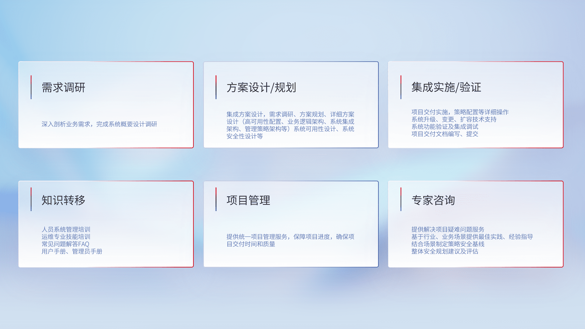 针对客户行业特性,,,,将宏观的安全战略和需求,,,通过专业的交付服务,,,,实现项目落地,,,,为客户提供标准规范的集成交付服务。。。。